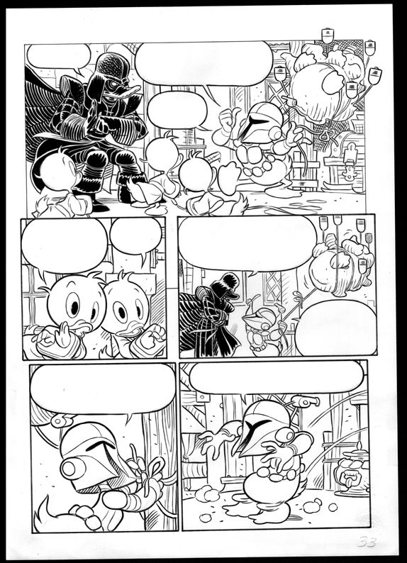 A.F.: Πράγματι. Δεν πρέπει όμως να ξεχνάμε πως είναι πάντοτε ο Ντόναλντ. Ο κλασικός Φάντομ Ντακ, για παράδειγμα, παρέμενε πάντοτε και Ντόναλντ. Θα ήθελα να επιστρέψουμε σε αυτά τα πλαίσια. Διαφορετικά, μιλάμε για ένα άλλο κόμικ. Κάποιου είδους… spinoff. Φυσικά, δεν μπορείς πάντα να το κοντρολάρεις. Όταν ξεκινάς μια νέα σειρά, βάζεις τις βάσεις, αλλά δεν ξέρεις πού θα καταλήξει. Εξελίσσεται μόνη της. Γίνεται τόσο ανεξέλεγκτη που, κάποια στιγμή, μετά από καιρό, πρέπει να τραβήξεις το χειρόφρενο και να δεις τι συμβαίνει γύρω σου: «πού μας έχει φτάσει αυτό το αφηγηματικό όχημα που ξεκίνησε… 10 χρόνια πριν»; Σε εκείνο το σημείο μπορείς, αν το θεωρείς αναγκαίο, να προχωρήσεις σε διορθώσεις. Αυτό συνέβη και με τον Doubleduck.