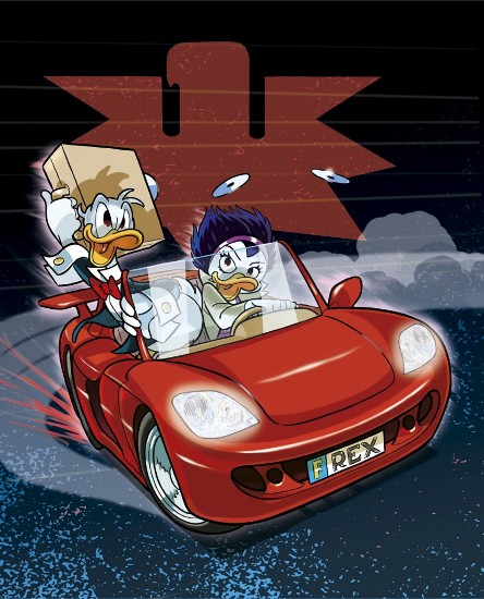 A.F.: Υπήρξα μαθητής του Carpi, οπότε καταλαβαίνεις πως το στιλ μου εξ αρχής ακολούθησε μία πολύ κλασική γραμμή. Όταν ξεκίνησα να δουλεύω στο PK, αποφάσισα να εγκαταλείψω ό,τι έκανα νωρίτερα και να δοκιμαστώ σε κάτι διαφορετικό. Η σειρά αυτή ήταν πολύ πειραματική και τολμηρή σε πολλά επίπεδα, από το σχεδιαστικό στιλ, στο στήσιμο των καρέ, των σελίδων… Ήταν μια διαρκής υπερβολή. Αυτό στην αρχή με δυσκόλεψε αρκετά. Όμως τρώγοντας έρχεται η όρεξη. Άπαξ και ξεκίνησα, με πήγε ο δρόμος από μόνος του εκεί που έπρεπε, κάτι που οφείλεται και στο εύπλαστο των χαρακτήρων του Disney. Οι διαφορετικές τεχνικές που άρχισα να χρησιμοποιώ, σιγά σιγά άρχισαν να γίνονται αισθητές και στις υπόλοιπες ιστορίες μου. Σα σχεδιαστής, στο πέρασμα των χρόνων, έχω πειραματιστεί πολύ. Τα τελευταία χρόνια έχω ερωτευτεί το κλασικό ύφος, διότι, δουλεύοντας αρκετά χρόνια στη Γερμανία, χρειάστηκε να προσαρμοστώ στο αμερικανικό στυλ, κοιτάζοντας τον Μπαρκς. Κατάλαβα πως το κοινό το οποίο αγαπάει τα Disney κόμικς, κατά βάθος προτιμά αυτή την εκδοχή τους. Αλλά ποιος ξέρει, ίσως του χρόνου τρελαθώ και αρχίσω να σχεδιάζω πάλι με άλλον τρόπο. Σε κάθε περίπτωση, το PK ήταν αυτό που άνοιξε για μένα αυτήν την πόρτα των αλλαγών.