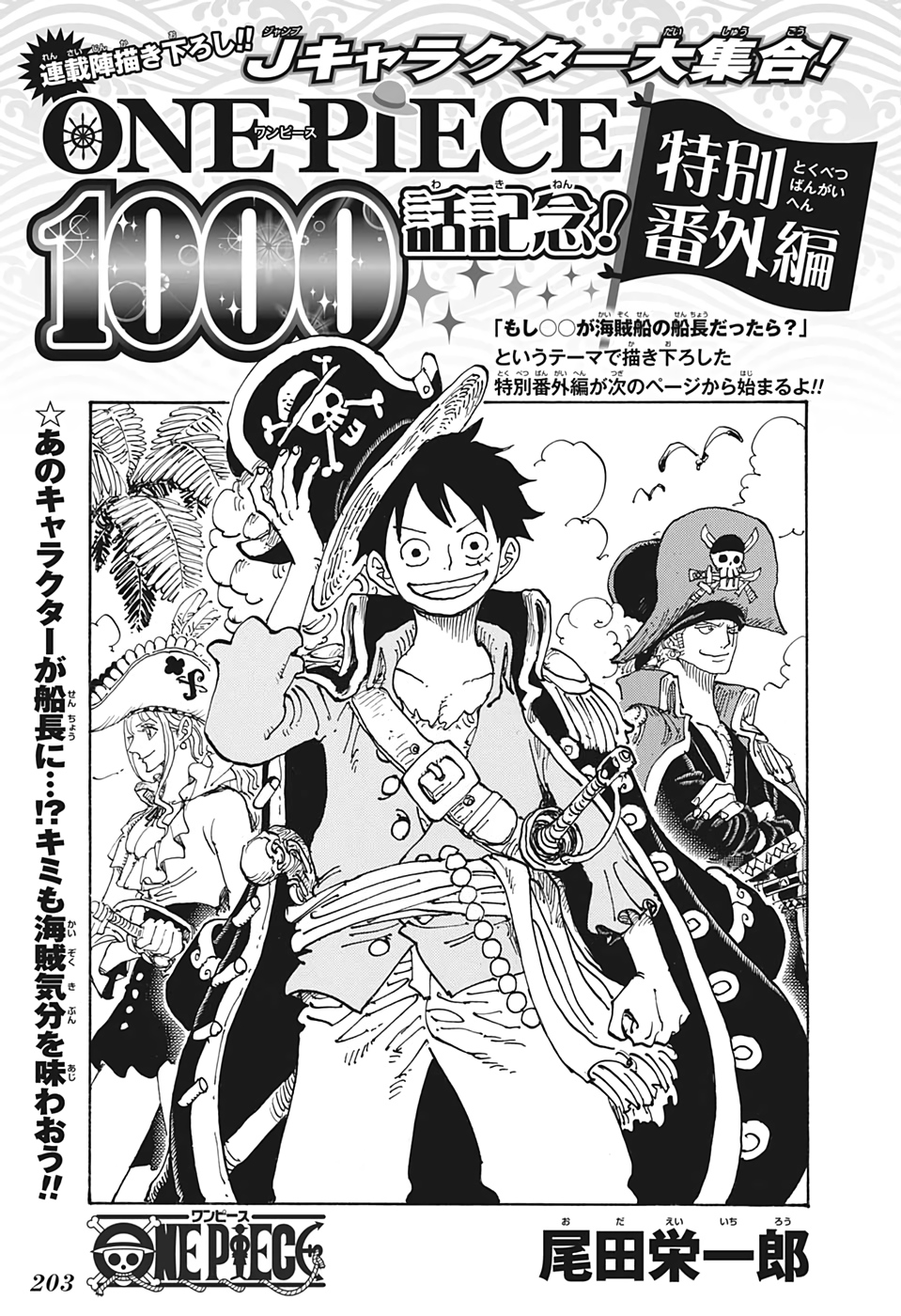 Έτσι λοιπόν, στο τεύχος του περιοδικού που κυκλοφόρησε το κεφάλαιο #1000, εκτός από τις ιστορίες των σημερινών συναδέλφων του Oda, ο αναγνώστης μπορούσε να βρει και μία ειδική, επετειακή ιστορία που ετοίμασαν, ως φόρο τιμής, όλοι οι τρέχοντες δημιουργοί (mangaka) του περιοδικού, σχεδιάζοντας λίγες σελίδες με τους ήρωές τους και τους ήρωες του Eiichiro Oda.