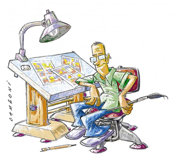 Silvio Camboni: Κατά τη γνώμη μου, δεν υπάρχει σχέση μεταξύ των συνέργων (είτε αυτά είναι στον υπολογιστή είτε όχι) και της δημιουργίας, κατά την ακριβή έννοια: οι ιδέες προέρχονται από το μυαλό, ή ακόμη και από την καρδιά. Πιστεύεις πως είναι καλύτερο να δημιουργείς ή να σχεδιάζεις με ένα μολύβι 2Β αντί με ένα ΗΒ; Αυτή η άποψη θεμελιώνεται στην πορεία, και αυτός που κάνει την διαφορά είναι μόνο και πάντα ο δημιουργός. Παρ’όλα αυτά, απ’ τη στιγμή που η διαδικασία της δημιουργίας ολοκληρώνεται, οι νέες τεχνολογίες αλλάζουν σχεδόν τα πάντα: υπάρχει μια μεγάλη διαφορα σε ό,τι αφορά την παραγωγή, την ροή της δουλειάς, την διαχείριση των πόρων και την επικοινωνία, σε σχέση με την εποχή που οι υπολογιστές ήταν σε αρχικό στάδιο και το Διαδίκτυο ανύπαρκτο. Επιπλέον, το Διαδίκτυο παρέχει άμεση πρόσβαση σε έναν τεράστιο αριθμό πληροφοριών και εικονων, και αυτό μερικές φορές βοηθάει να έρθουν ιδέες. Εγώ χρησιμοποιώ με επιφυλακτικότητα την υπολογιστή και τις εφαρμογές που χρειάζομαι για τη δουλειά μου, αλλά τα περισσότερα από αυτά που κάνω γίνονται με τον παραδοσιακό τρόπο, με μολύβι, γόμμα και χαρτί.
