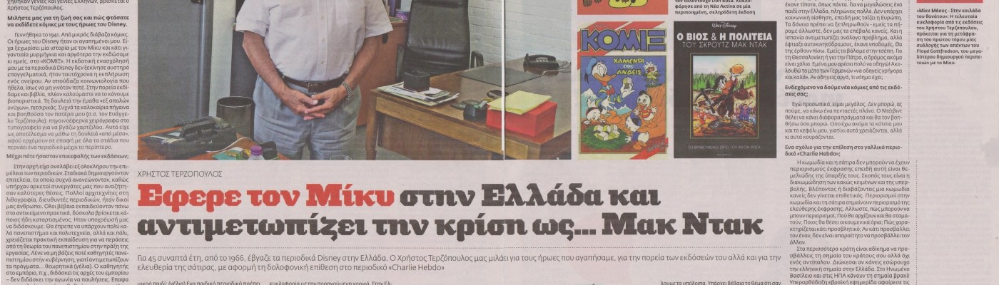 Εκτός όλων αυτών, ο Χρήστος Τερζόπουλος για 45 συναπτά έτη, από το 1966, έβγαζε τα περιοδικά Disney στην Ελλάδα. «Μίκυ Μάους», «Ντόναλντ», «ΚΟΜΙΞ», «Αλμανάκο»… Το 2012 τη θέση του ανέλαβε ο υιός του Ντέιβιντ, μέχρι που έληξε το συμβόλαιο και πλέον οι συγκεκριμένοι –και άλλοι – τίτλοι πέρασαν στα χέρια των Καθημερινών Εκδόσεων. Πίσω από αυτούς τους τίτλους, με τους οποίους γαλουχήθηκαν γενιές και γενιές Ελλήνων, βρίσκεται ο Χρήστος Τερζόπουλος, με τον οποίο συναντήθηκα για μία ενδιαφέρουσα συζήτηση.