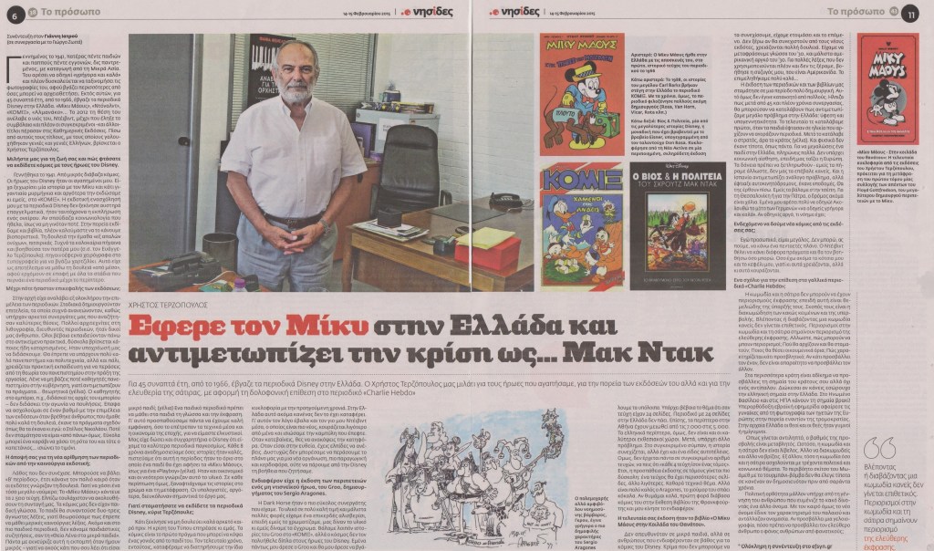 Η πορεία της συνέντευξης, από την πραγματοποίησή της το Σεπτέμβριο του 2014 μέχρι την τελική της δημοσίευση τον Φεβρουάριο του 2015, είναι μια άλλη μεγάλη ιστορία, την οποία θα αφήσω για κάποιαν άλλη φορά. Αυτό που έχει σημασία, είναι πως η κατάληξη να δημοσιευτεί στο ένθετο «Νησίδες» της Εφημερίδας των Συντακτών, μετά την καθοριστική συμβολή του Γιάννη Κουκουλά, αποτέλεσε την αφετηρία για ένα νέο προσωπικό κεφάλαιο: την επαναλαμβανόμενη συνεργασία με την Εφημερίδα των Συντακτών, κυρίως μέσα από τις φιλόξενες σελίδες του «καρέ-καρέ», του μοναδικού εβδομαδιαίου ενθέτου για κόμικς στον ελληνικό Τύπο.